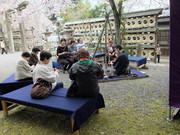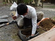 大石神社桜まつり 数日前よりの天気予報では4月3日は雨天とのことで危ぶまれていた桜まつりも、おかげさまで花曇りの暑くもなく寒くもない好天に恵まれました。 境内には樹齢80年とはいえ見事な大木である御神木大石桜(枝垂)があります。例年、大石桜は参道や境内各所の染井吉野に比べ早い開花ですが、今年は開花前に霜が降り、さくら祭に併せたように境内は百花満開の境内となりました。 例年、卜深庵はこの桜まつりの野点席を担当しています。今回で造園業の川崎泰大氏と数寄屋大工の木村全伸氏が中心となり、瓦で炉を作り、青竹3本を組んで道也作になる雲竜釜を釣り、紅葉絵の旅箪笥を用いて野点の点前で参会者にお茶を差し上げました。家元不徹斎宗匠の「祥春」と認められた短冊を青竹に立て、花は満開の桜とし、茶器は桜町天皇の宮廷歌壇の有力者であった江戸時代の公家日野資枝の好みで土佐光貞下絵になる桜蒔絵棗銘「山里」を用いました。茶碗は玉水焼の黒で一啜斎が「春雨」と命銘したもの、替に4月1日から連日催されている都をどりで戦前使われていた団子絵茶碗、そして宗旦四天王のひとり杉木普斎の茶杓「かけひ(筧)」、煙草盆に聿斎好みの木地の紙巻用の皆具、お菓子は桜餅でした。 珍しい趣向に来客者は花に目をやるのではなく、じっと点前をご覧になって楽しんでいただきました。