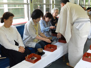 客は天目茶碗を持ったまま、そこに浄瓶でお湯を注ぎ茶筅で点てる。四頭茶会にできるだけ似せた形でお茶をお出ししました。