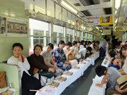 点心は、電車での茶会ということで、京都で昔から駅弁をつくっておられる萩の家さんにお願いして、昔ながらの経木の香りを感じる駅弁をこの日の為に少しアレンジしてご用意。また、缶ビールにワンカップで日本酒をお出しするなどして電車での食事の雰囲気を味わって頂きました。 岐路、揺られながら車内アナウンスを参加者のお子さんが担当してくれるなどし、 終止笑い声の絶えない車内でした。